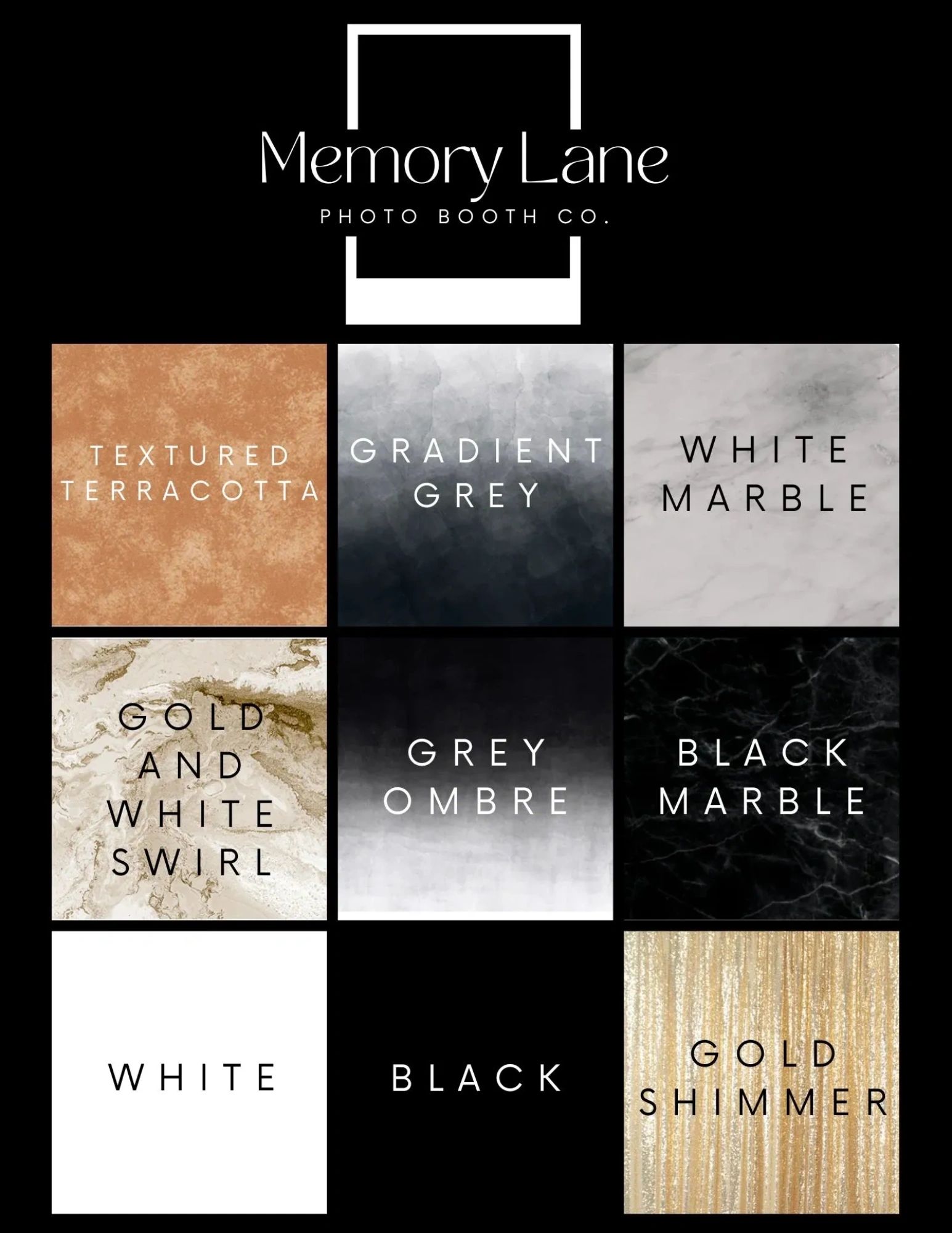 At Memory Lane Photo Booth Co., we offer a variety of stylish backdrops to fit the theme of your event. From elegant and classic to classy and festive, we've got something for every occasion! Whether you're hosting a wedding, birthday, or corporate event, our selection will help set the stage for picture-perfect memories. Don't see what you're looking for? Let us know, and we can find a backdrop tailored to your vision.